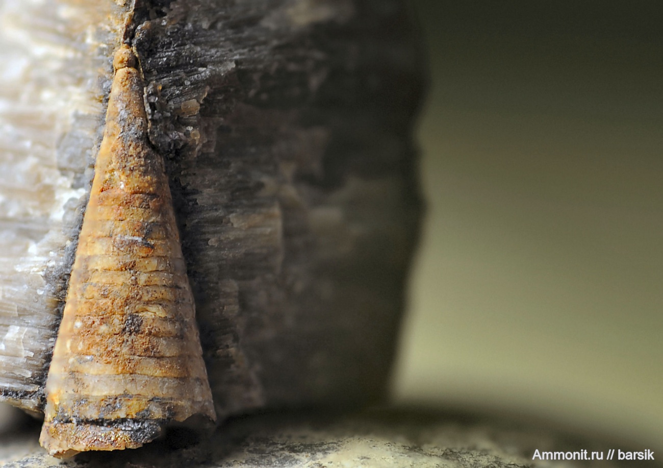 Еще один замещенный фрагмокон с сохранившимся протоконхом ростра ааленского белемнита из разреза реки Хусса-Кардоникская.