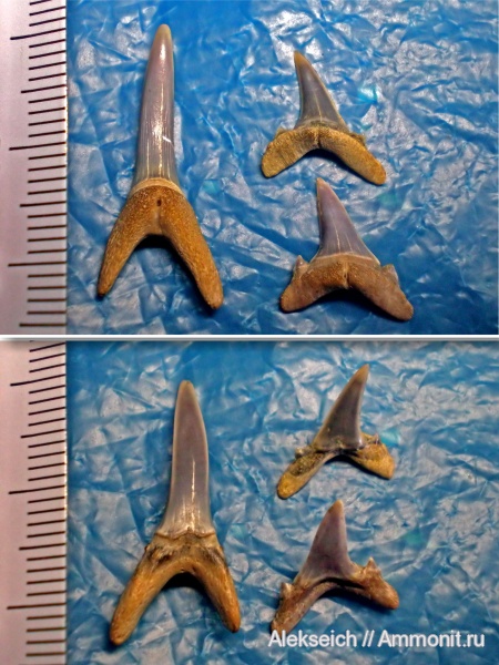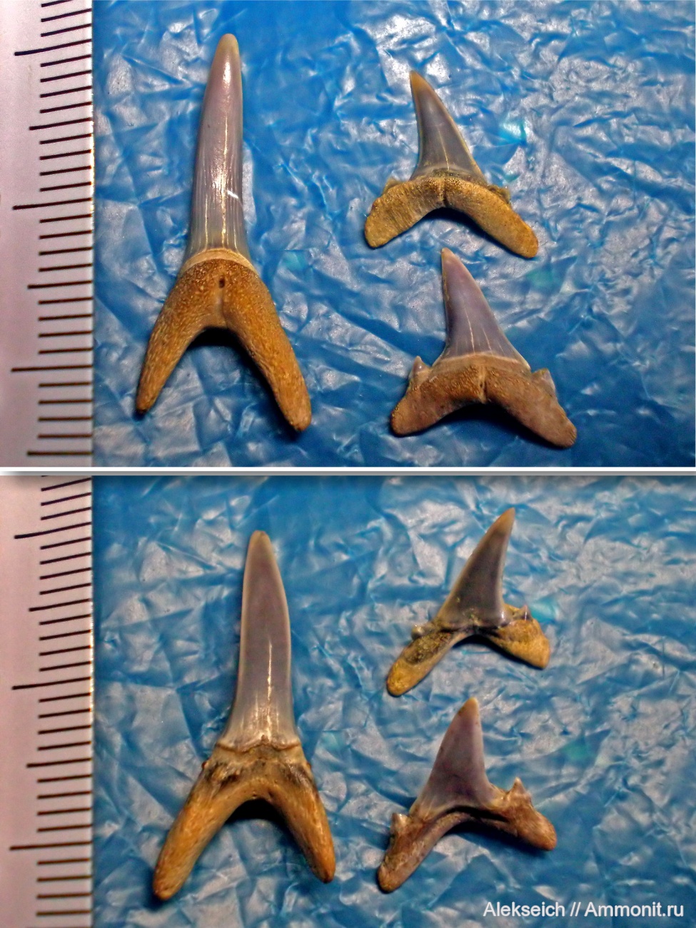 Это передний зуб стриатолямии и два боковых зуба какого - то кархариаса. | ||||||