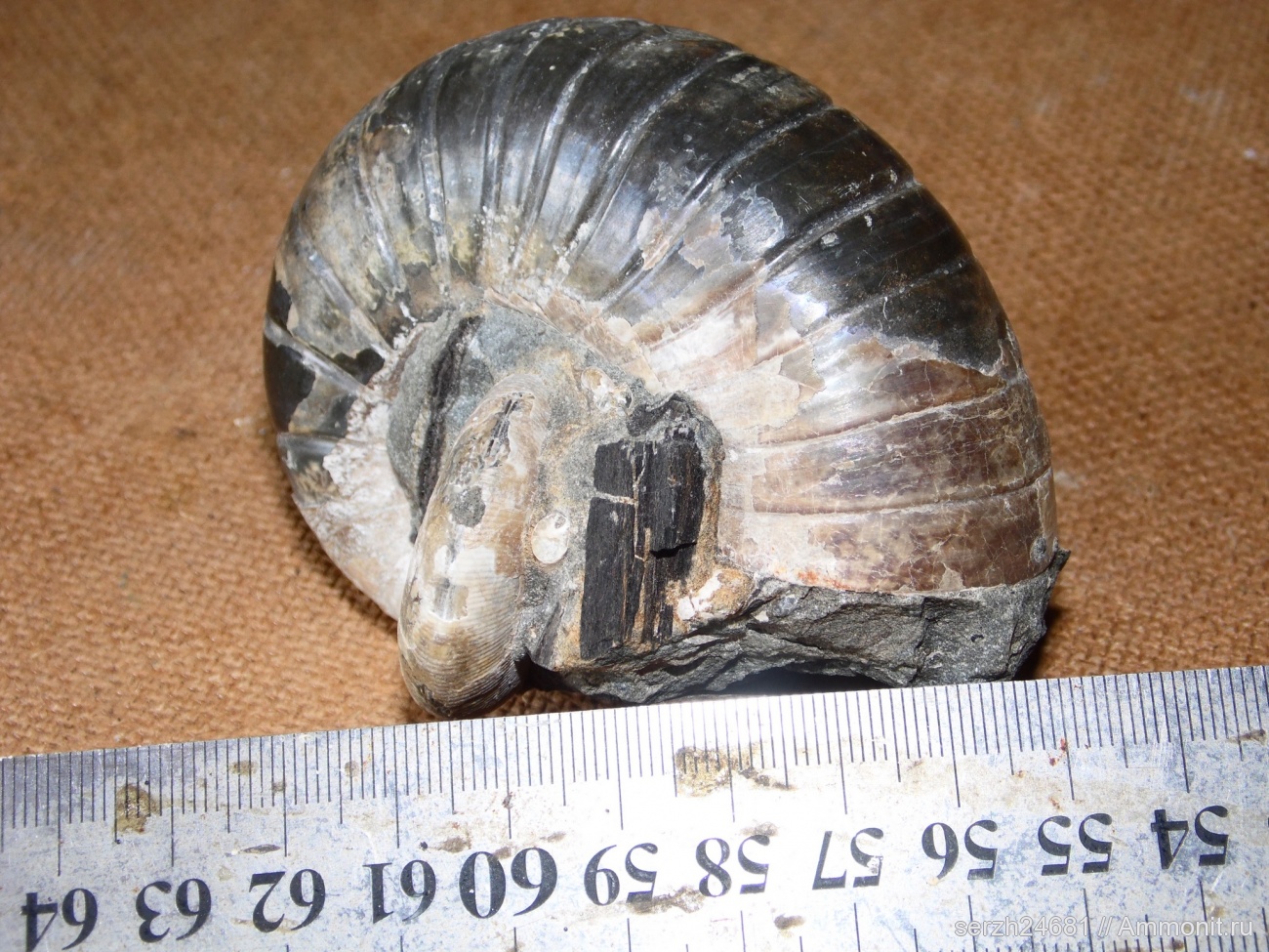 Люблю этот вид аммонитов. И этот - хороший экземпляр. Но, пардон, где тут устье? Судя по фото (вживую лучше видно, конечно), в районе деревяшки обломанные остатки еще пары камер. | ||||||