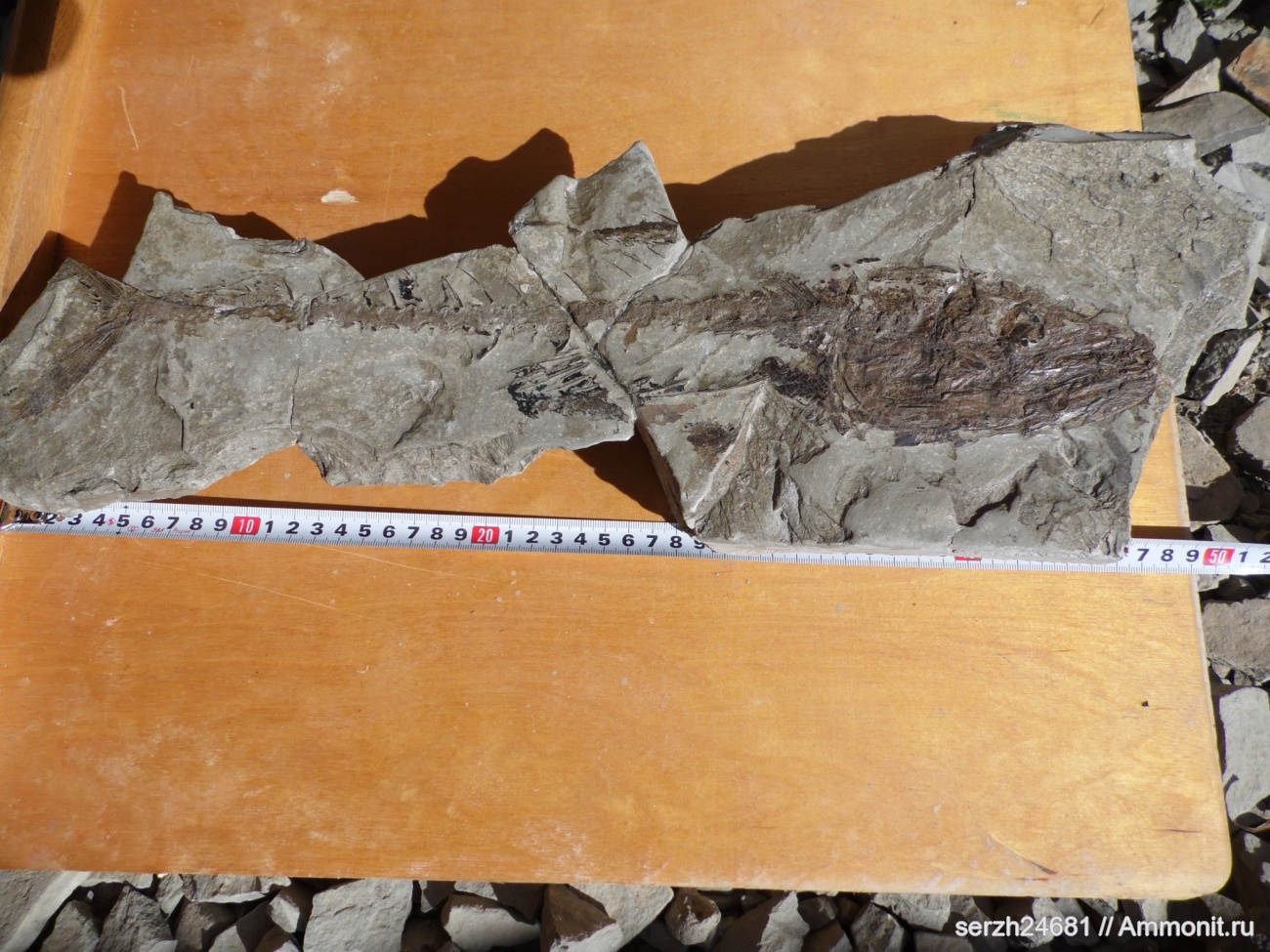 Образец найден в мягких пластах синей глины в притоке р. Пшеха.Предположительно принадлежит к семейству Скумбриевые (Scomber sp ).При приближении просматриваются зубы.Рыба как бы с недобрым взглядом.