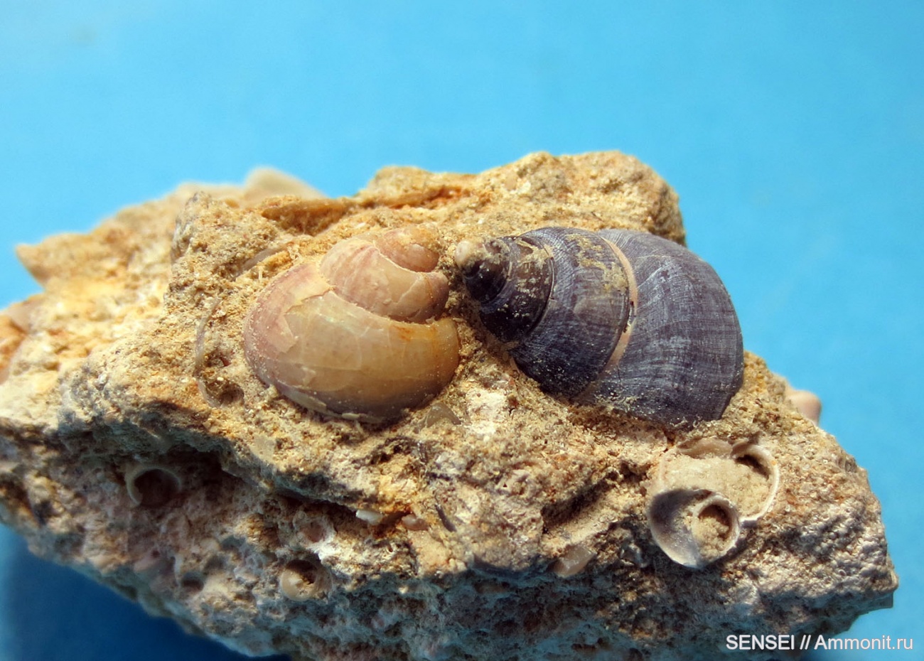 Такие разные,по цвету,раковины одного(предположительно Trochidae)семейства,найденые в одном слое,на едином матриксе. Высота чёрной-10мм.