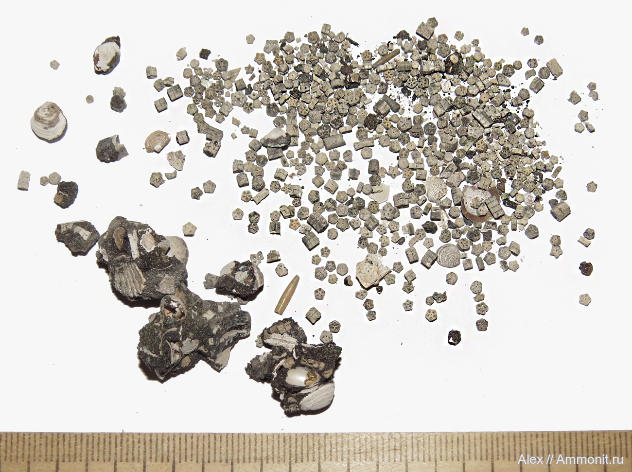 В Мневниках в зоне fulgens довольно многочисленны прослои белого ракушечного лома, ракушняка. Как-то я пробовал промывать этот ракушняк, но он оказался очень бедным на находки, в отличие от похожих слоев из нижележащей зоны nikitini. Но недавно оказалось, что не все эти прослои состоят из обломков брахиопод и двустворок - попадаются и линзы, практически целиком состоящие из члеников криноидей. На фото - результат промывки одной такой линзы. Интересно, что в небольшом объеме вместе лежали членики совершенно разной формы - от круглых до разнообразных пятиконечных.