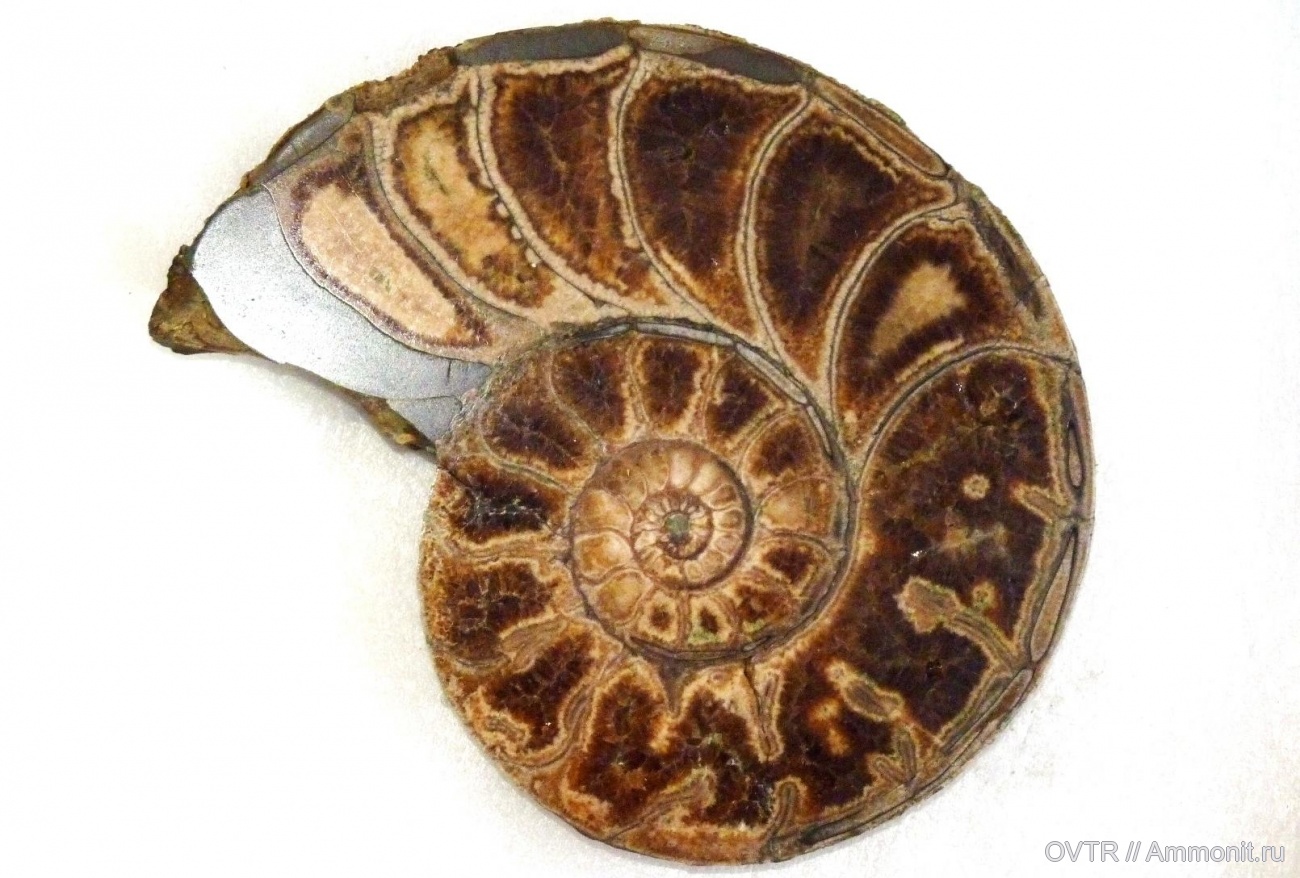 Диаметр 22,8 см. Плюсы: рисунок и цвет, сифон в разрезе (в т.ч. заполненный кальцитом, что бывает редко), пупок кальцитовый (толщина раковины в р-не пупка менее 1 мм). Минусы: раковина склеена из 3-х частей.