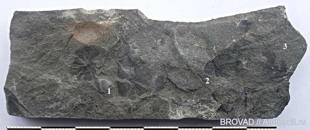 1-Sphenophyllum majus Bronn.; 2-Neuropteris tenuifolia Schlotheim; 3-Mariopteris latifolia (Brongn.)Zeill.