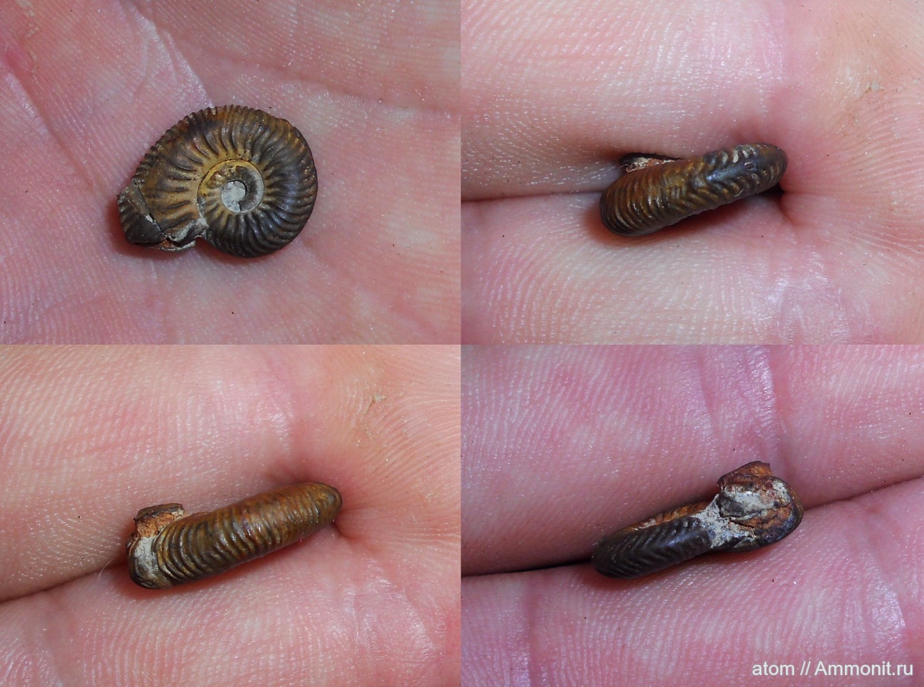 Повреждённый когда-то аммонит в последствии изменил форму раковины и начал расти изменённым. Размер 1,5см.