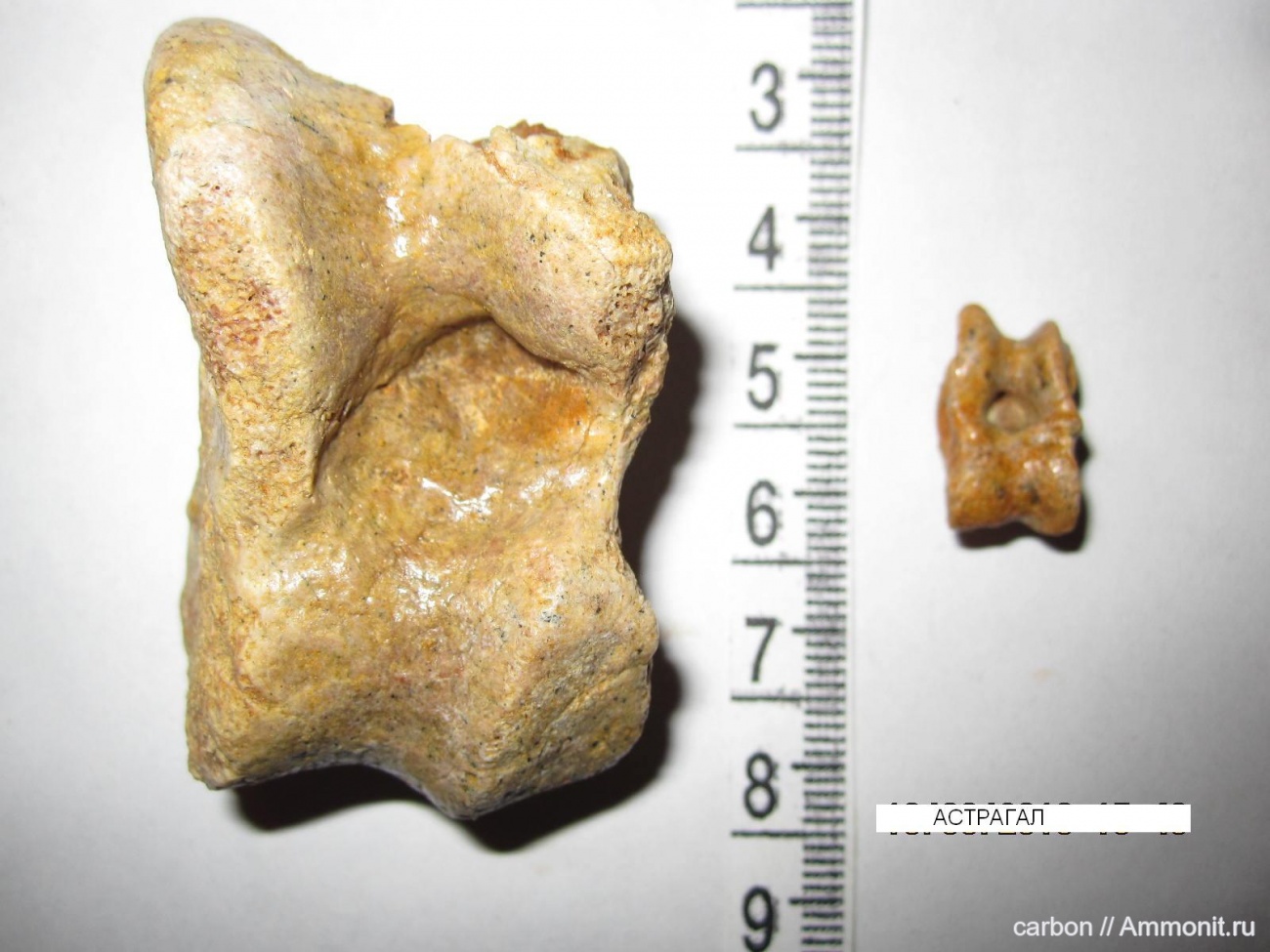 Астрагалы млекопитающих Олигоцена Приаралья. Слева астрагал свинообразного,возможно антракотерия. Размерный класс крупного кабана. Справа астрагал оленька.