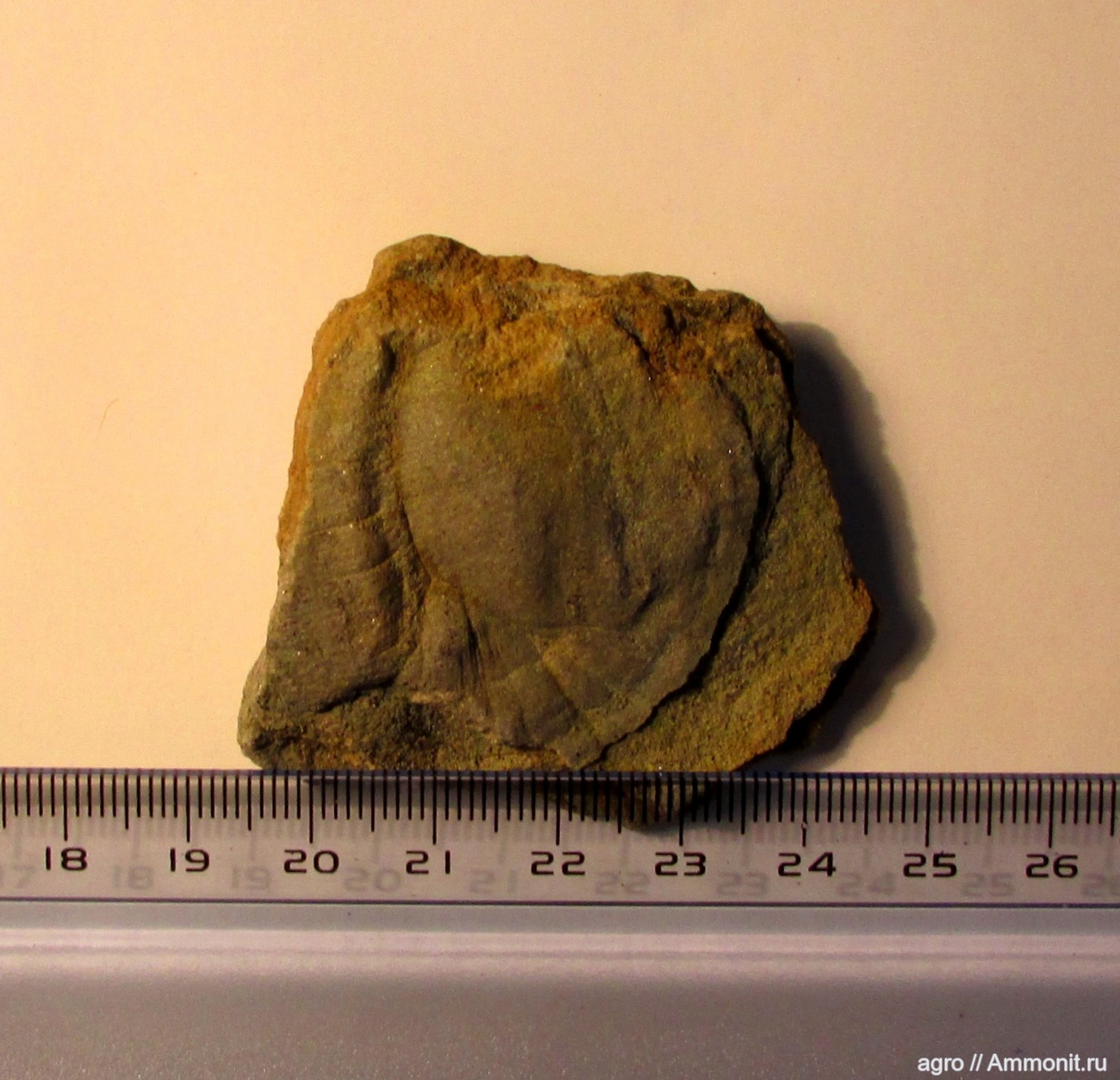 Для чайника похожа на миалсемию. А если приглядеться, то образец лишь в общих чертах внешне напоминает окаменелость Mialsemia (она известна по одному образцу, который на самом деле является плохосохранившейся рангеей). Этот образец является фрагментом отпечатка прикрепителього диска (как луковица) какого-то организма. При жизни организма от диска отходил толстый стебель (как зелень у лука), во время фиссилизации стебель сжало песком, и на диске образовались складки смятия.