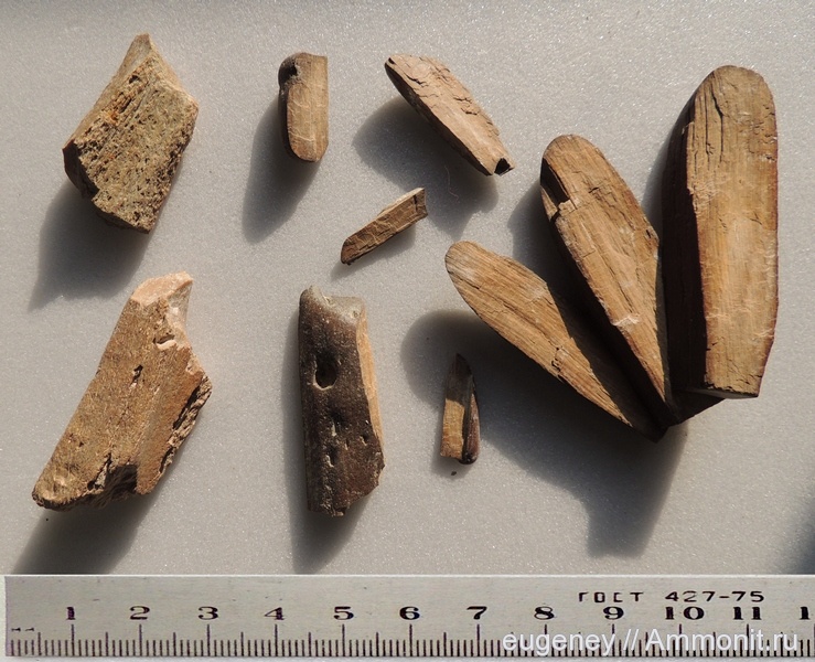 Вот с тех-же слоев я насобирал таких- же образцов! это скорее дерево, а левые верхний и нижний скорее косточки, фото с торца развеет все сомнения! | ||||||