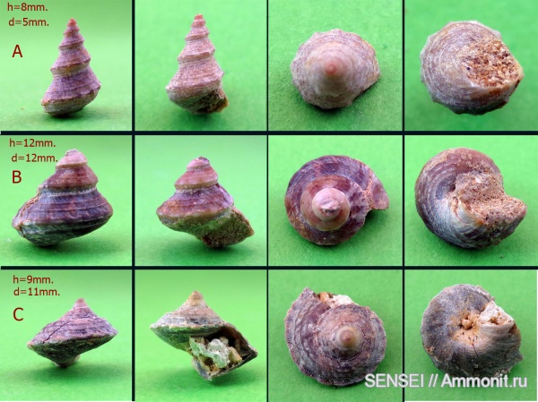 В этой таблице дано сравнение трёх видов раковин Trochus,некоторыми чертами похожими между собой (бугорчатый киль,спиральная струйчатость,оползающие обороты,двойной киль последнего оборота),но тем не менее относящихся к разным видам.А-Trochus adelae d'Orb.;В-Trochus subblainvillei Sinz.;С-"Trochus" blainvillei D'Orbigny, 1844. Хорошо заметна разная удлинённость раковин(отношение длины к ширине).