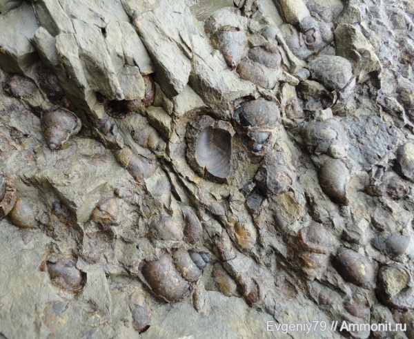 Отдыхая на городском пляже г. Большой Камень, с удивлением обнаружил в прибрежной гальке огромное количество окатанных ядер гастропод. Через 20 минут поиска нашелся их источник. Слой мощностью до 40 см состоящий из окаменевших гастропод с редким вкраплением двустворок.