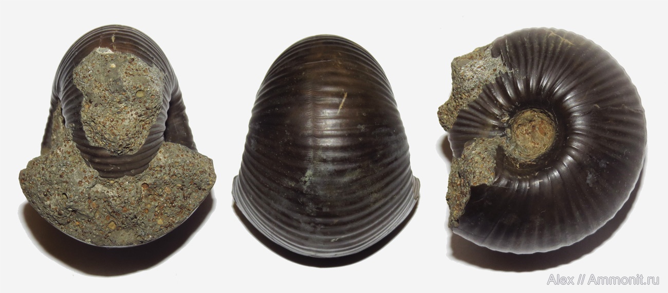 Аммонит Cadoceras durum, погибший в молодом возрасте. Диаметр этой раковины 4,5 см, ширина 3,8 см. Диаметр взрослых раковин (все Rondiceras - макроконхи) превышает 15 см, а ребра у них сглаживаются.