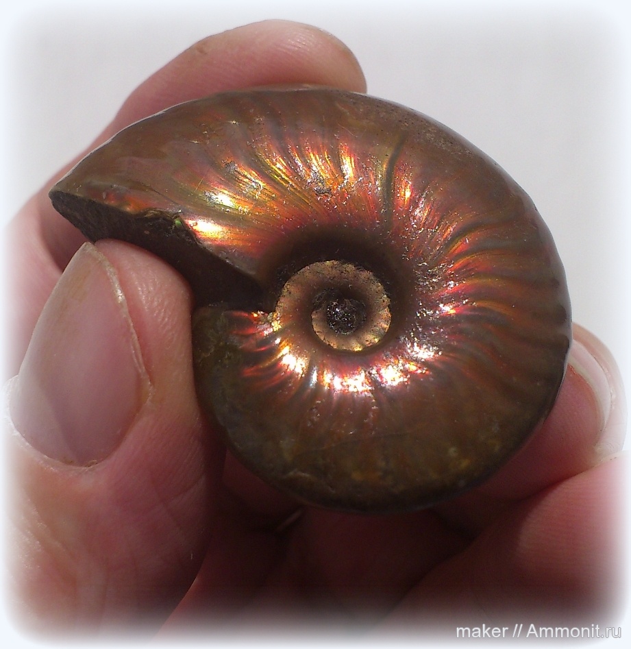 Cтало скучно и решил прикупить мадагаскарского аммонита на исследование))). Признаюсь - забавные цацки. Жаль тамошние препараторы их убивают... Видимо поврежденные раковины пускают на обточку с полировкой. Снимается верхний слой раковины с радужкой, повреждения сошлифовывают до ядра, скрывая таким образом. При этом полупрозрачный слой раковины играет внутренней радужкой, создавая яркие эффекты. В общем торгаши свое дело знают. Жаль только убивают аммонитов...