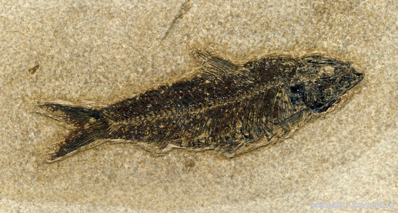 Эта рыбка Knightia оказалась с обратной стороны матрикса с Парочкой рыбок Priscacara Liops из формации Green River, Вайоминг, США.