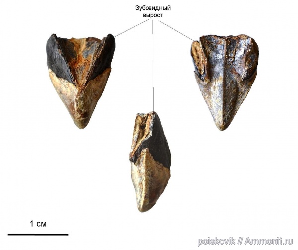 В литературе "зубовидным выростом" называют выступ на нижней стороне, который очень хорошо виден например на этом фото. У а данного ринхолита зубовидного выроста как раз и нет. Отмеченная тут черная штука - это остатки органической части клюва, в котором был ринхолит, редко сохраняющаяся вещь. | ||||||