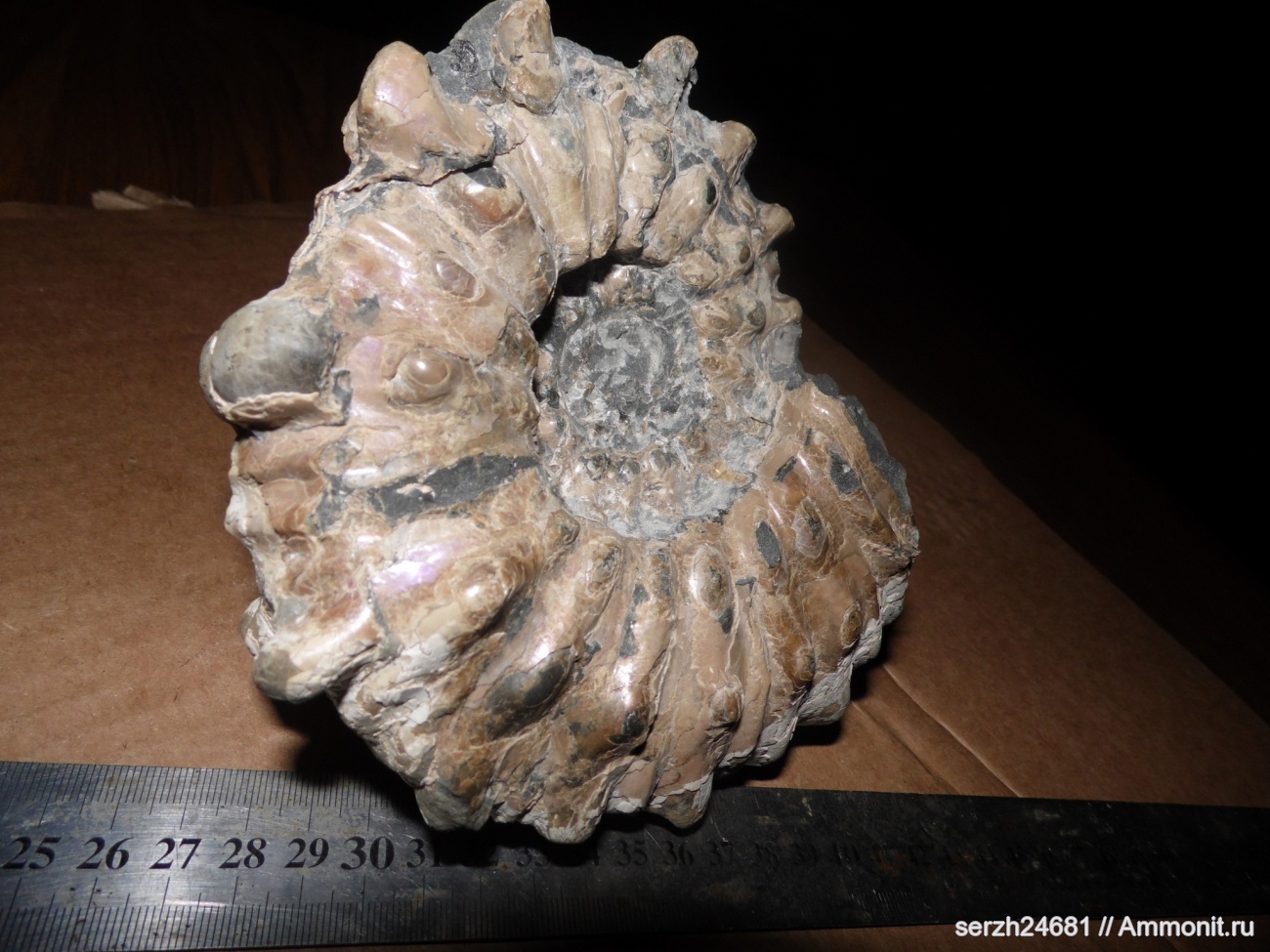 Было бы намного легче определить такого аммонита, если бы он был представлен на фото не только сбоку, но и с вентра, например как здесь. Потому что по такому фото я не очень понимаю, широкий он или узкий и как у него расположены шипы. | ||||||