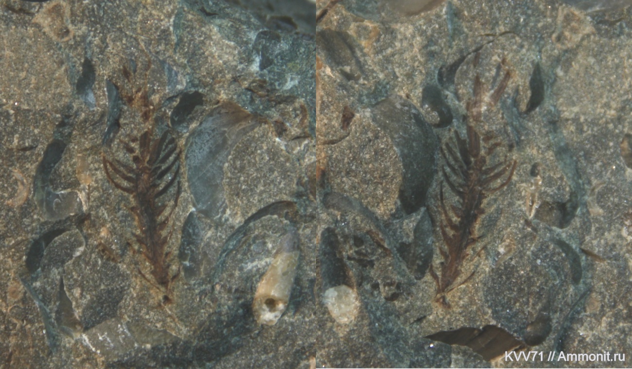 При вскрытии аптской конкреции с аммонитами, белемнитами и брахиоподами первый раз за все время встретилась вот такая веточка (предположительно хвойного дерева) размером 20 мм.