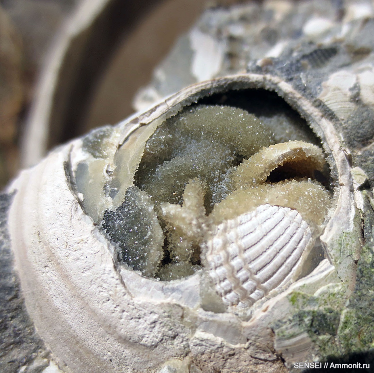 Да,Вы правы,в раковине побольше расположилось несколько створок поменьше,некоторые полностью скрыты под кальцитовой щеткой. Спасибо! | ||||||