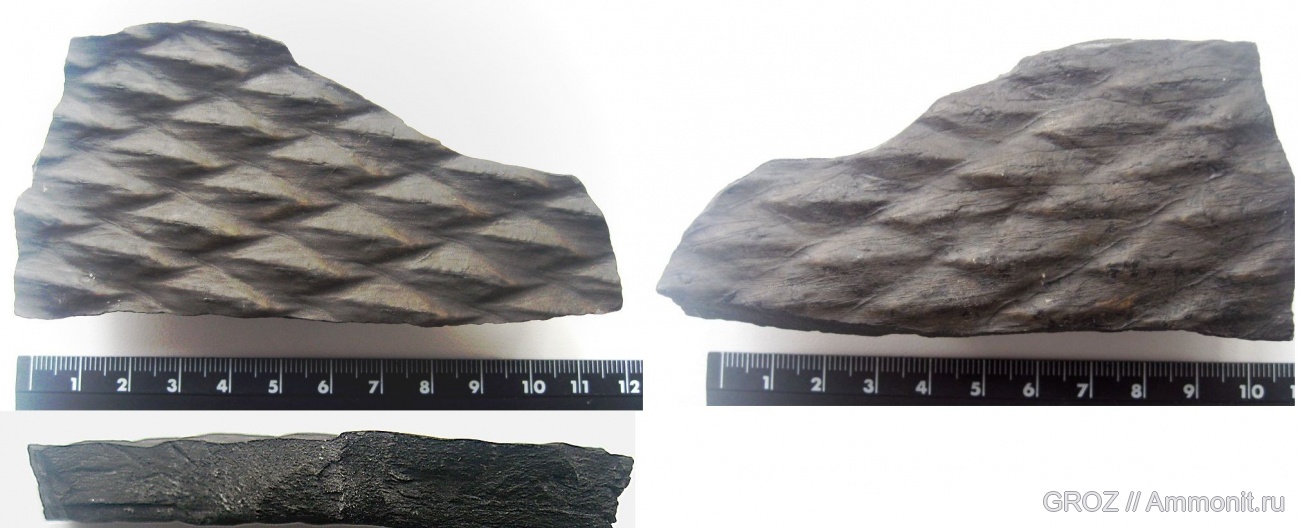 В Донбассе, в угольной шахте, на глубине около 700 метров среди угля и пустых пород (песчаник, сланец) найдена плоская окаменелость с чешуевидными отпечатками. Причем идентичные отпечатки с обеих сторон пластины (толщина пластины около 12-15 мм). На границе угля и породы часто попадаются отпечатки листьев на песчанике или сланце - а эта окаменелость имеет отпечатки с обеих сторон!