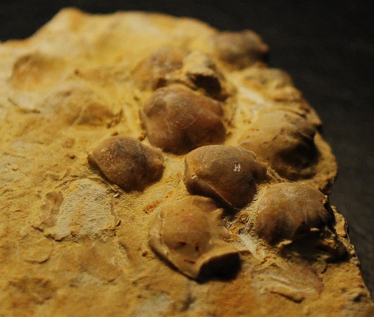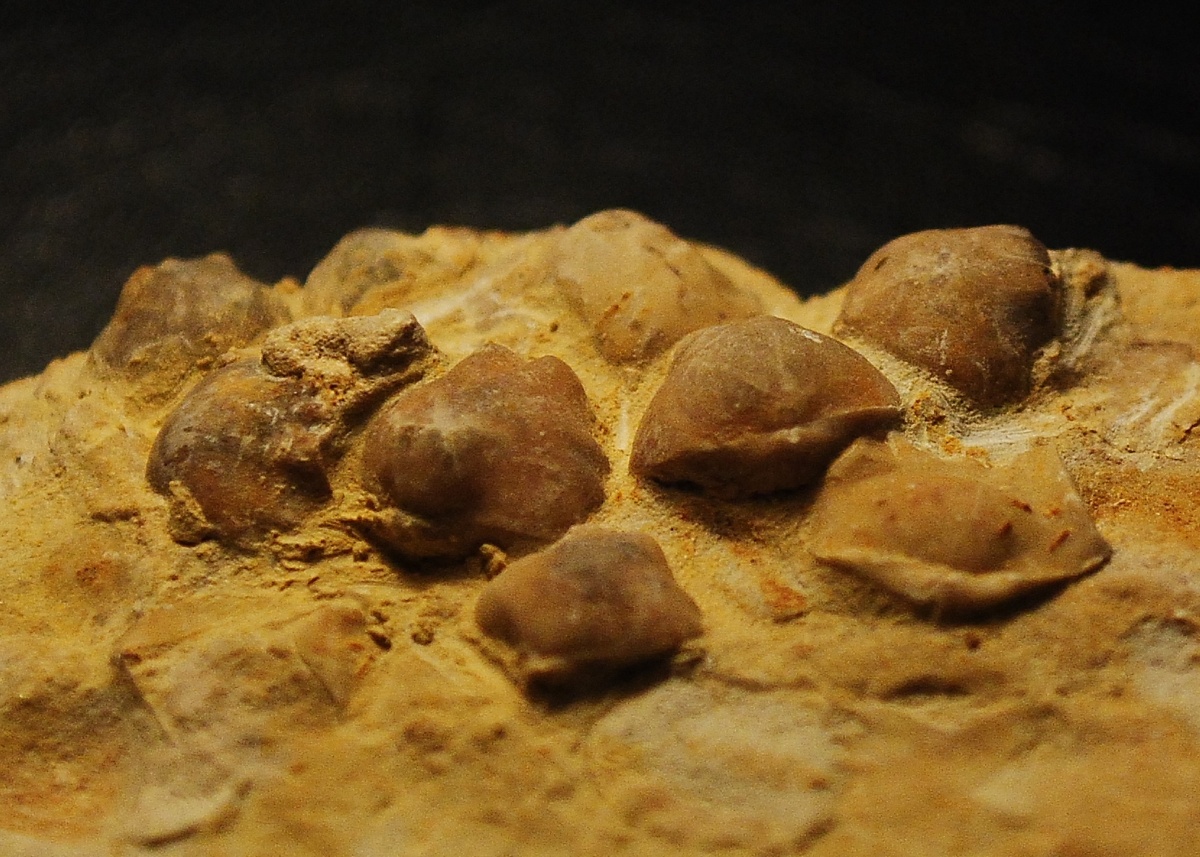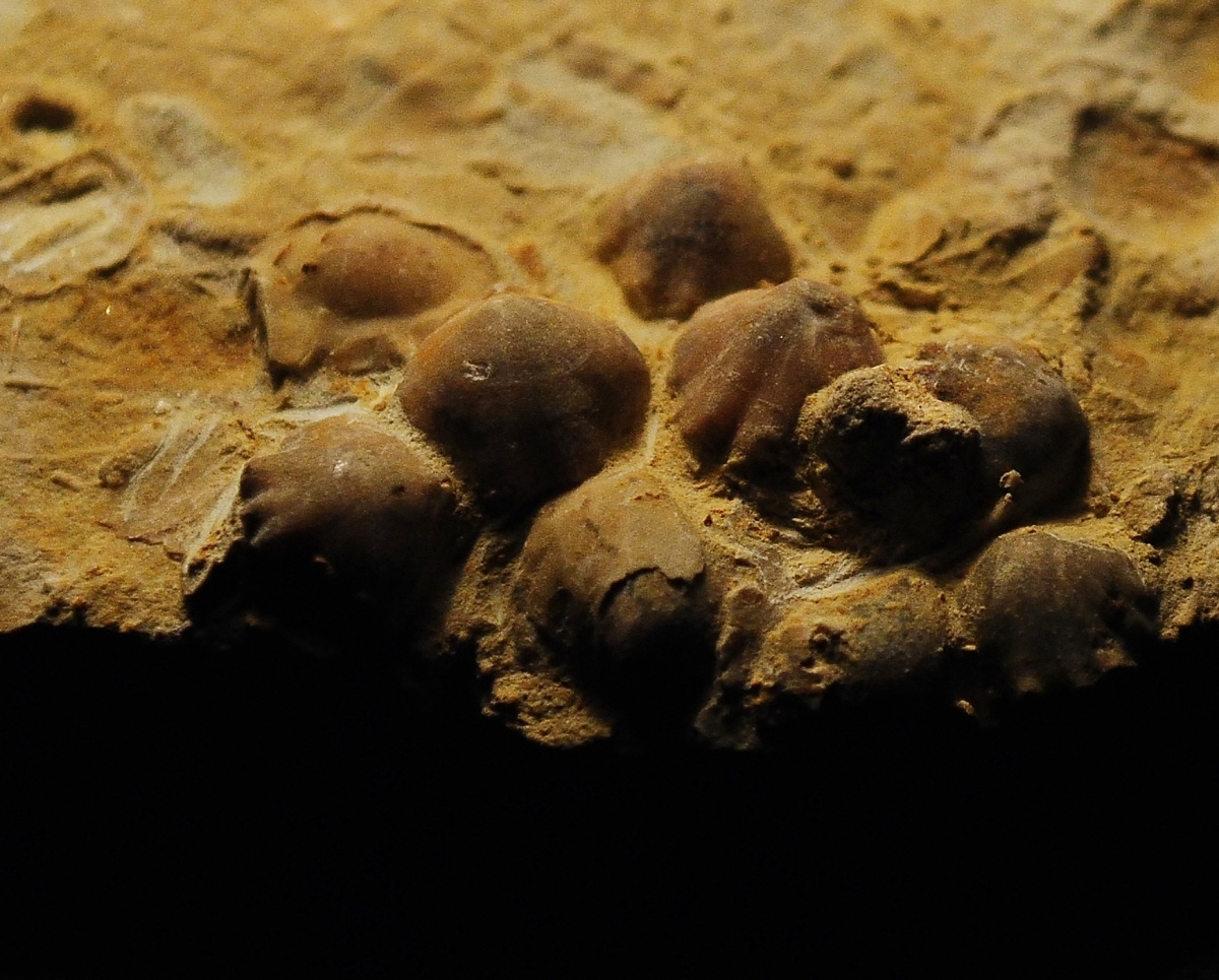 Видны углубления по всей плитки известняка,по форме и размеру схожие с брахиоподами в правом углу.