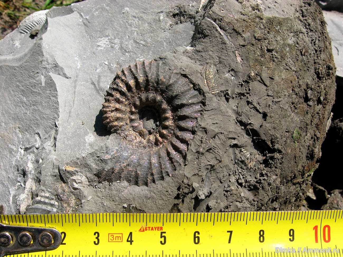 Конкреция, плотная, хотя аммониты в ней немного давленные. Конкреция из толщи темных плотных глин у уреза воды. | ||||||