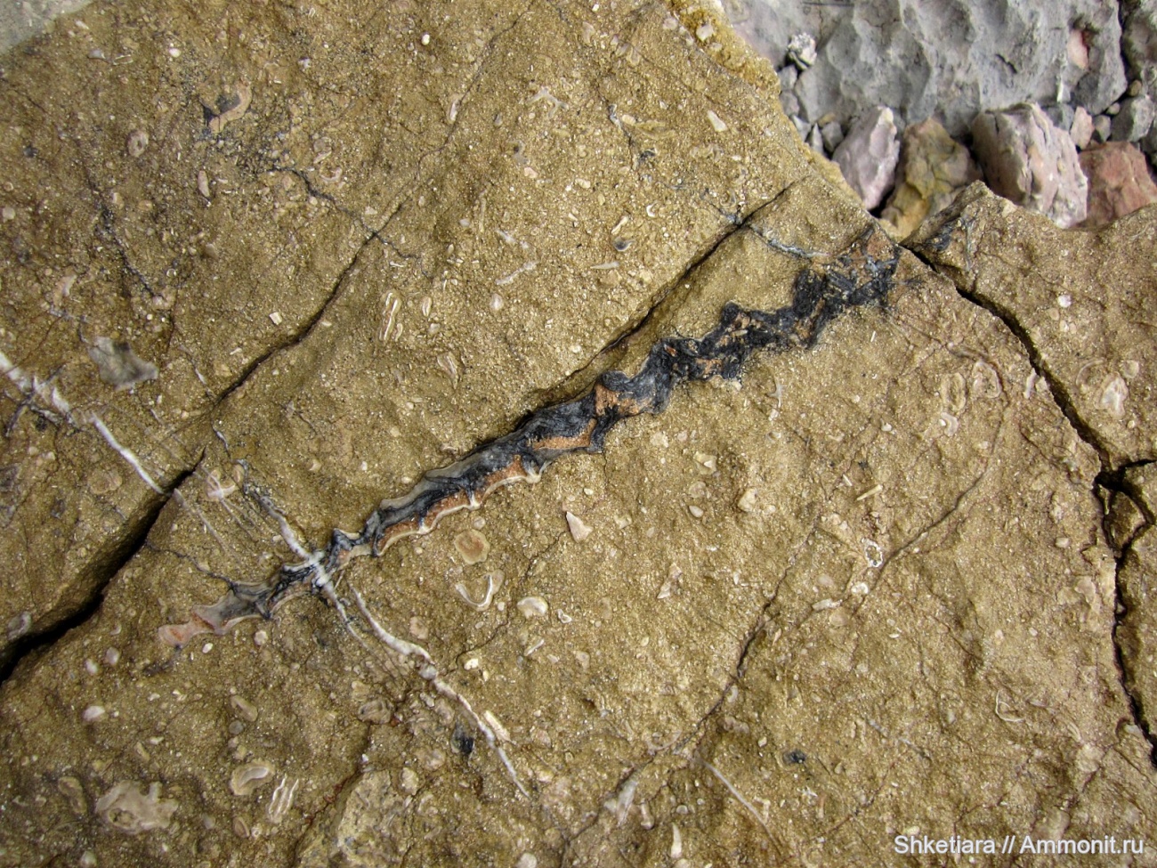 Угу, не совсем целая. Там не очень хорошо видно, но мне кажется, в правой верхней части снимка, уже за трещиной, все-таки видно часть устья, то есть сильно длиннее в эту сторону она не была. Может быть, еще немного было в сторону вершины, срез раковины поверхностью прошел, вероятно, не точно по оси. | ||||||