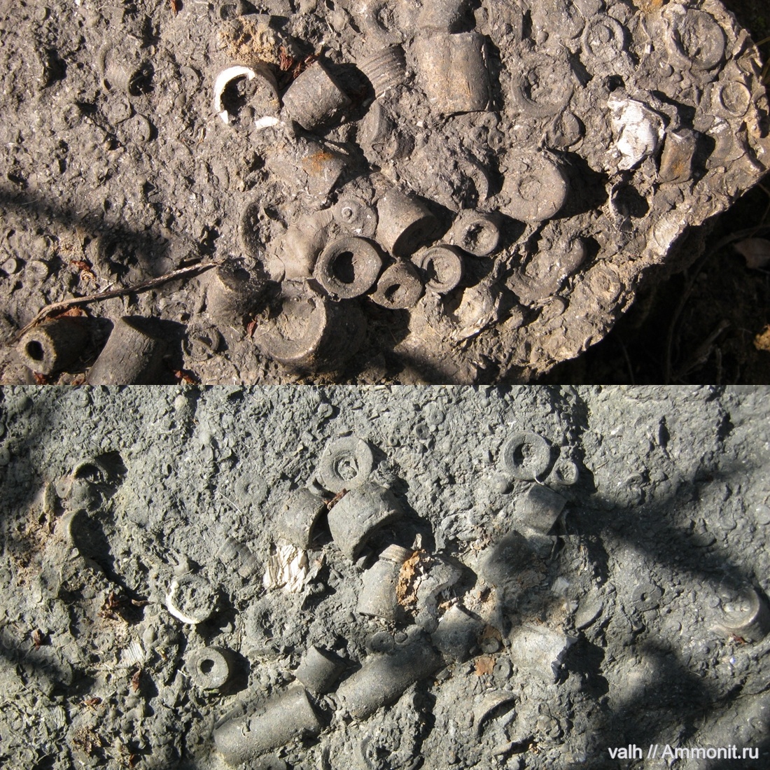 Здесь часть плиты криноидных известняков сфотографирована,очевидно из нижней подсвиты стешевского горизонта,там слой такой есть.В нижней части чисто криноидные,несколько метров выше должен быть криноидно -брахиоподовый.Но сами слои в разрезе я не видел,только плиты из них. | ||||||