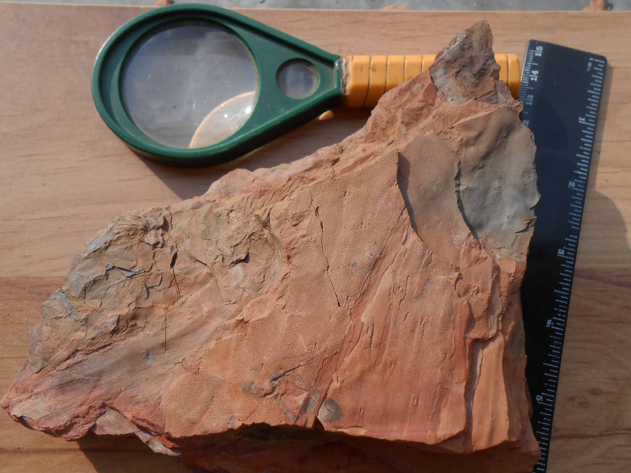 Спасибо! Образец необычный, довольно большой участок декортицированной коры, который накладывается на два небольших фрагмента верхнего слоя коры довольно хорошей сохранности. Необычно также расстояние между листовыми рубцами на первом слое - 15мм, что говорит скорее о стволе, нежели ветви. | ||||||