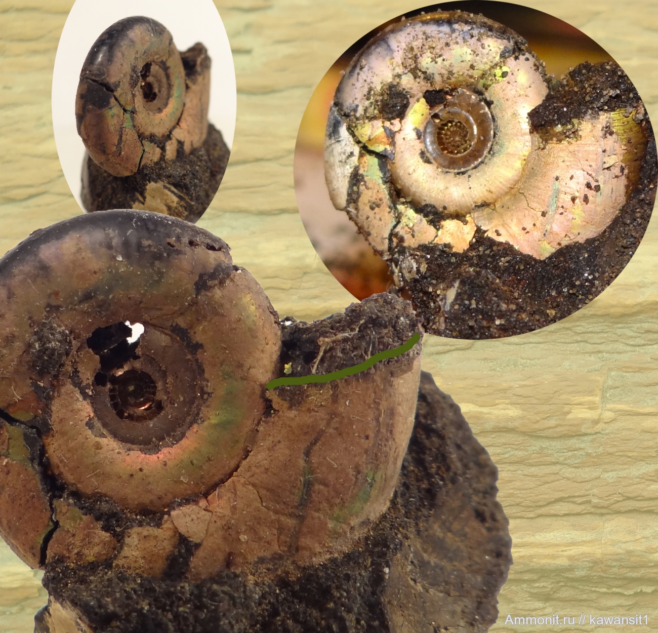 Да по длине жилой камеры подходит для устья. А край устья и не всегда идеально ровный, он бывает и выщербленный и непонятно почему - то ли кто-то обкусал по-мелочи уже после смерти аммонита, то ли, вероятнее, крупные песчинки слегка обломали под давлением вышележащих слоев. | ||||||
