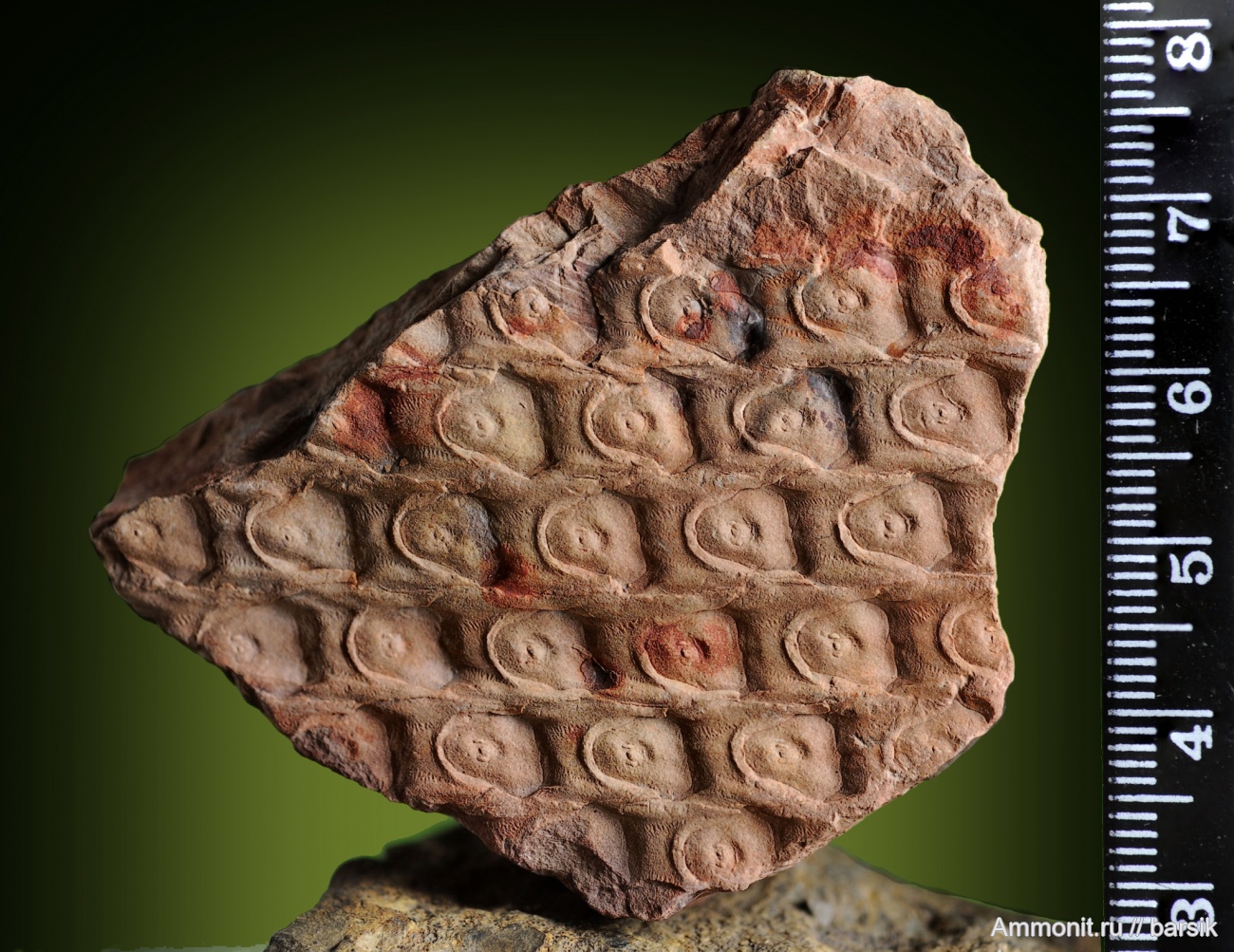 Сохранение достаточно хорошо и можно рассмотреть все детали строения: - борозда, ребро, листовой рубец, складочки между листовыми рубцами, рубчики от проводящего пучка. Слева листовой рубец отделяют полулунные полоски.
