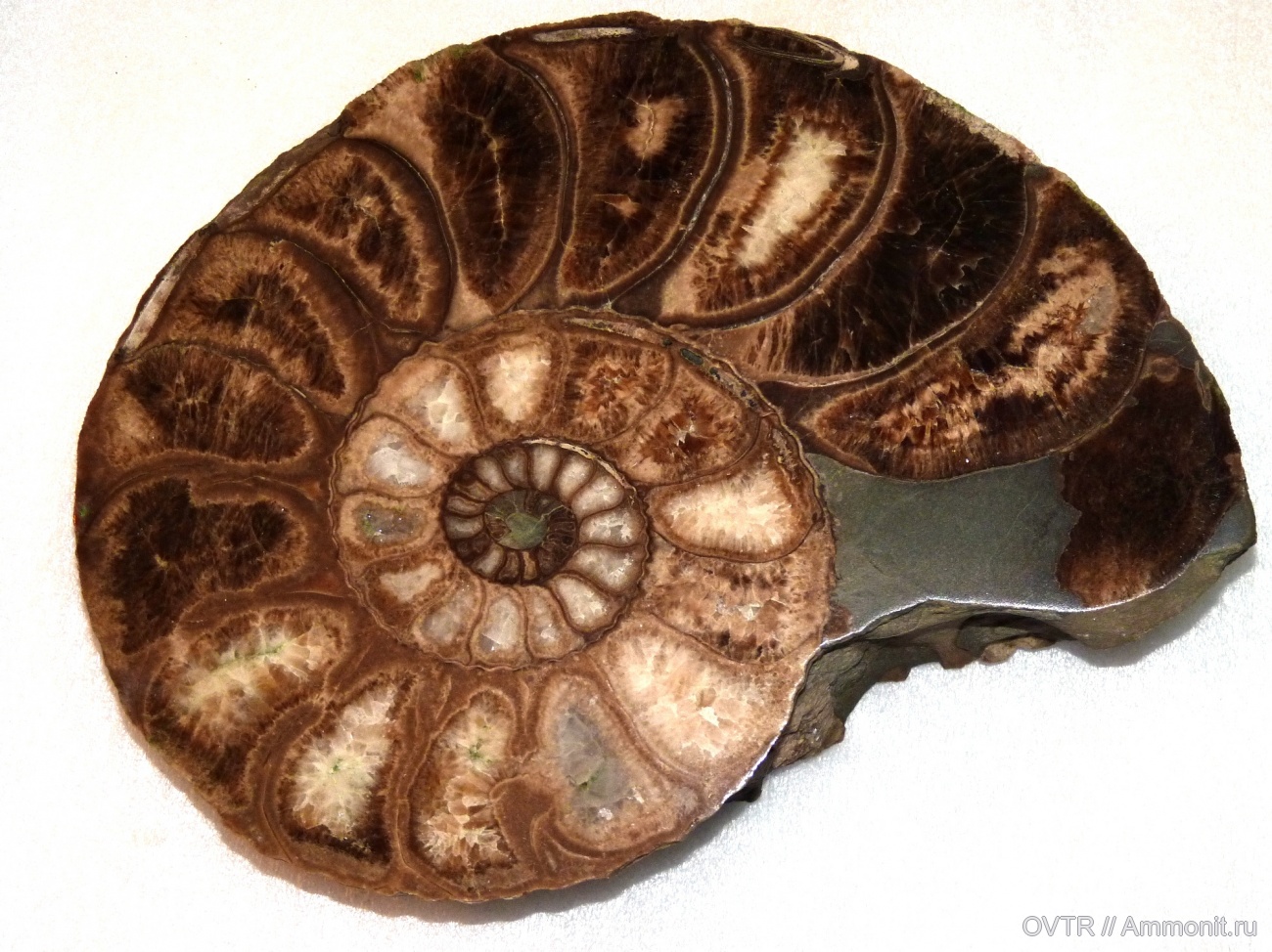 Полированная половинка Parahoplites(?) 19,5см. Обращает внимание, что раквоина давленная в одной плоскости. Вопрос - прижизненная деформация или дигенетическая - не решен. Я не вижу никаких диагенетических признаков, хоть это и удивительно.