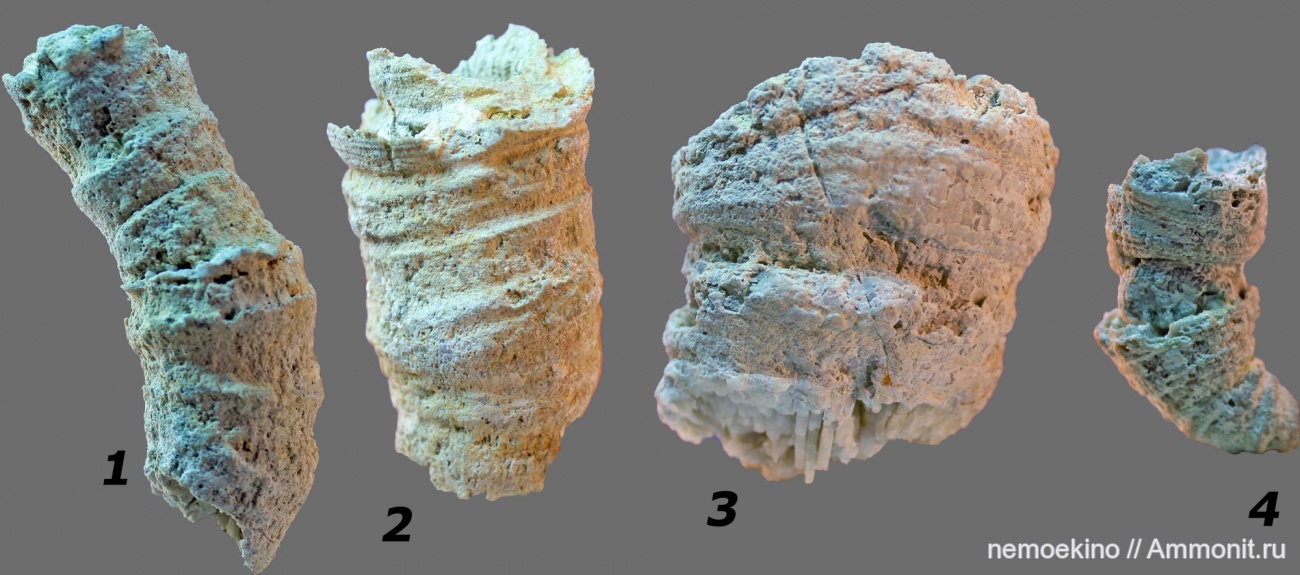 Есть такое явление у ругоз и некоторых склерактиний,1й и 4й образец имеют к этому отношение.Явление недостаточно хорошо изучено,но правильнее рассматривать это явление как регенерацию.Большая часть полипа по какой либо причине погибает и из оставшейся живой ткани полипа,может развиться новый полип,который начинает строить кораллит фактически заново. | ||||||