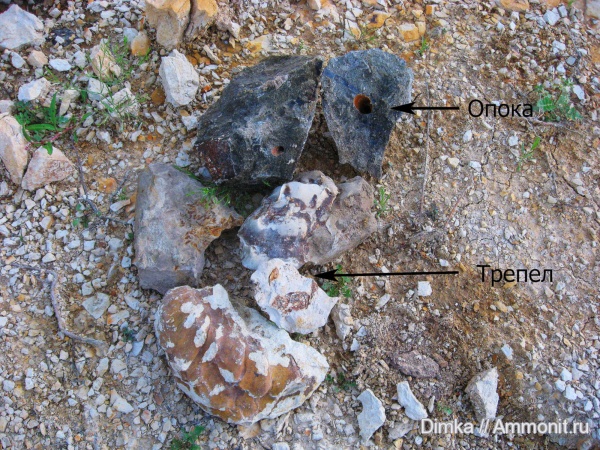 Более темные и плотные опоки с полостями от растворившихся ростров белемнитов. И более хрупкие и светлые трепелы с двустворками и др. ископаемыми.