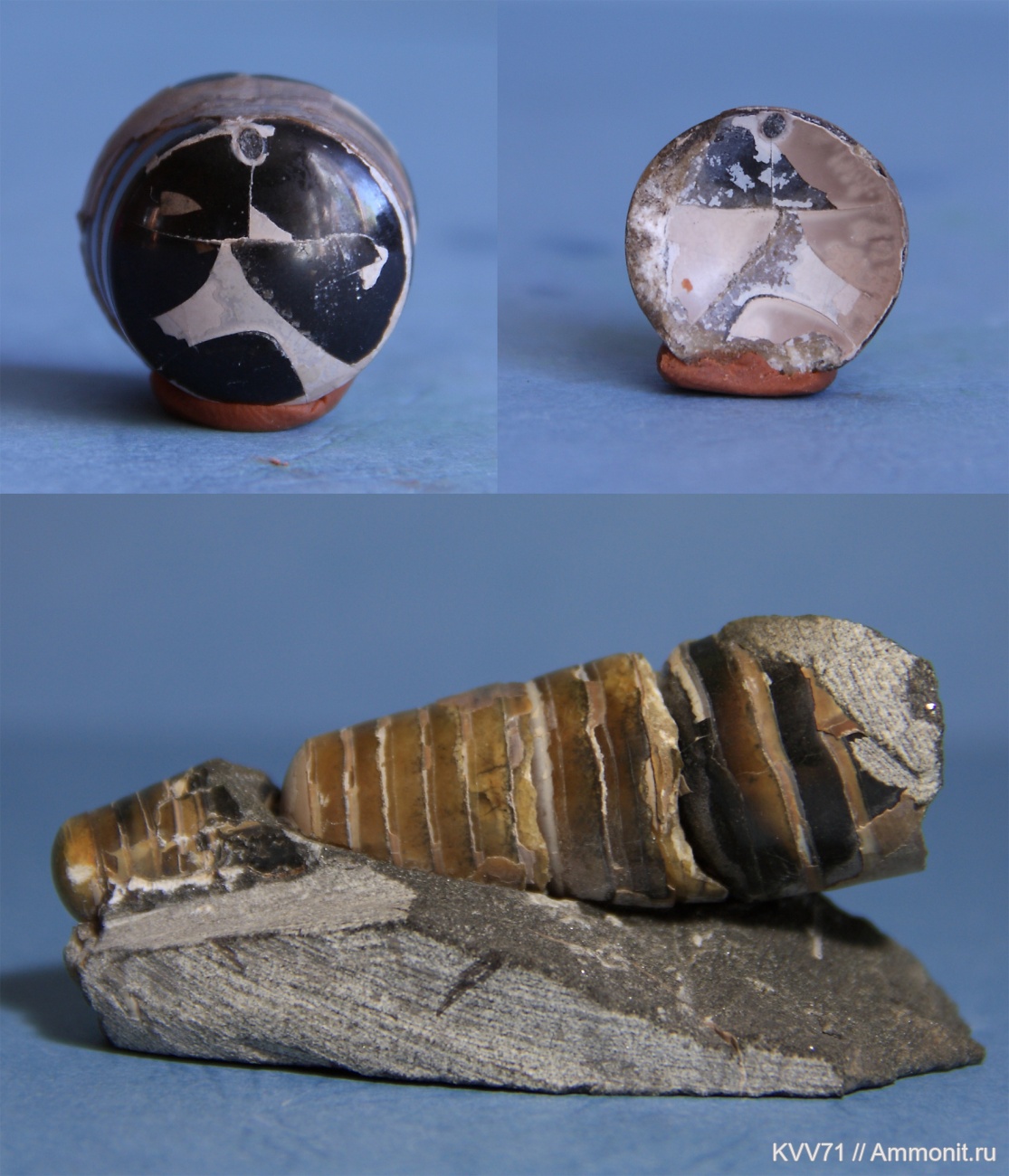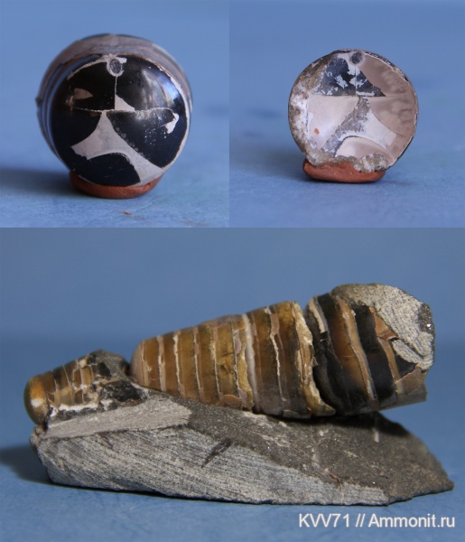Фрагмокон найден в конкреции в 15 км от р. Хокодзь в совместной поездке с Тимуром (rastr). При разбивании конкреции он, незамеченный, развалился по камерам. И увидев его, мы с Тимуром с замиранием сердца друг у друга спросили - сифон по центру? Оказалось, что нет.