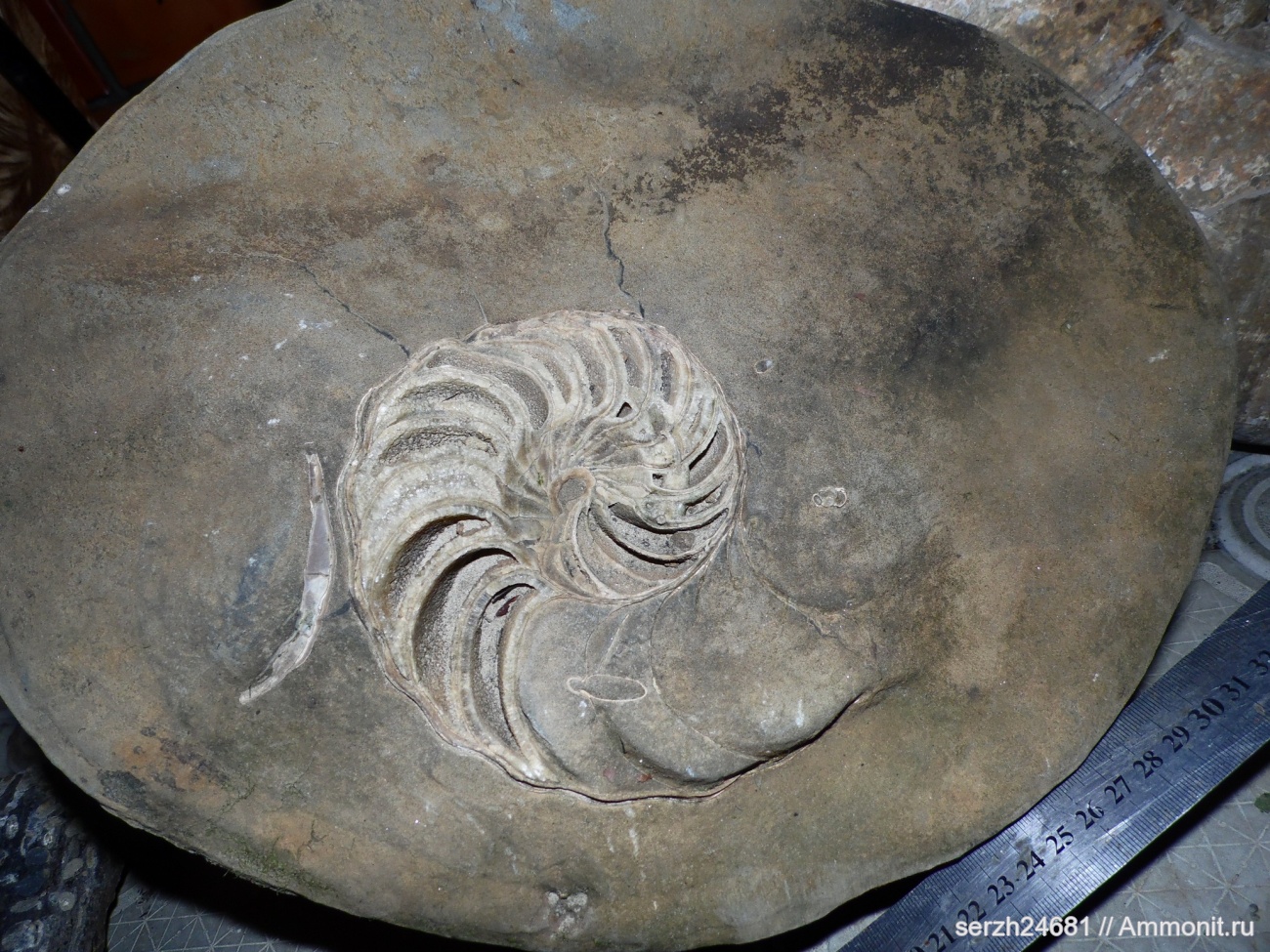 Не аммонита, а наутилуса serzh24681 правильно определил его. посмотрите в нижней части (заполненные породой камеры) виден срез центрального сифона и сверху правее центра виден сифон. Наутилус это. | ||||||