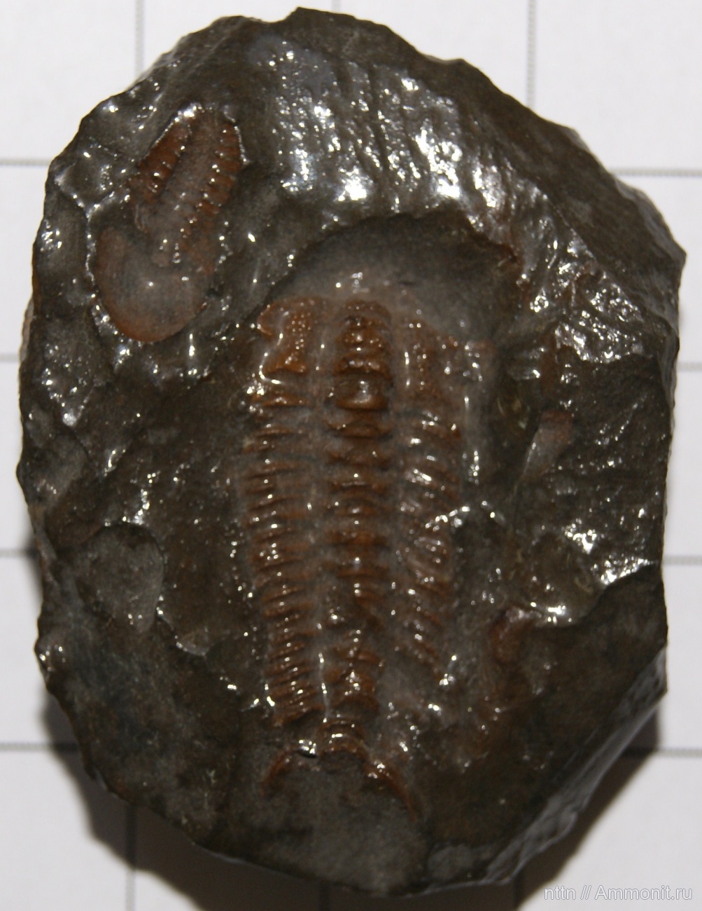 Это слепок, как и остальные образцы трилобитов и насекомых (ежи и брахиопода вроде настоящие). Из-за этого у них такой странный вид. Sao - кембрийский род, знаменитый по восстановленной последовательности возрастных стадий от личинки до взрослого Иоахимом Баррандом. Так что карбон надо заменить на кембрий. | ||||||