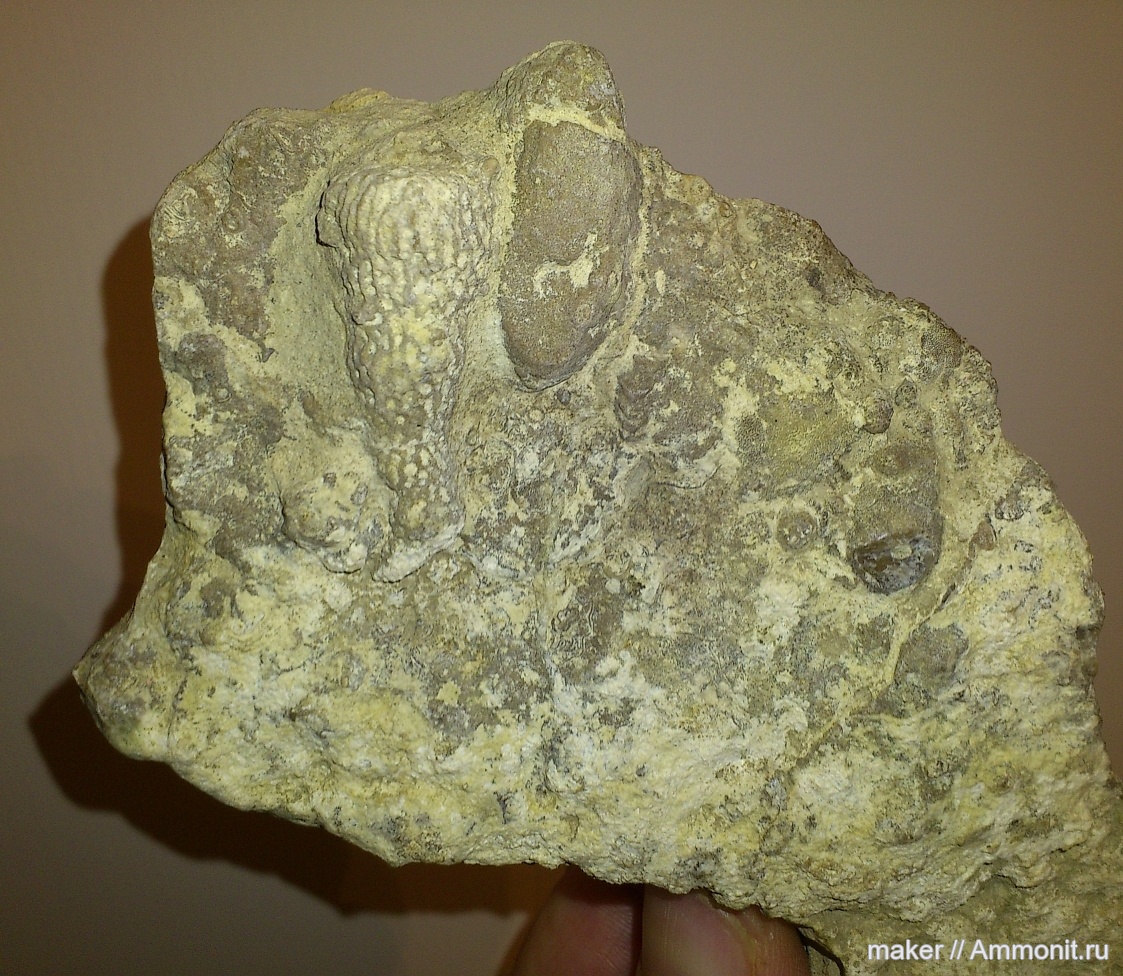 Небольшая (~3) см губка в посмертном положении на фрагменте морского дна. Место, где она упокоилась, представляло собой плотную поверхность. Далее на нее осел ил... В какую-то эпоху ил был разрушен... и фрагмент с губкой осел в глиноподобной пачке... Так и дошел до наших дней...