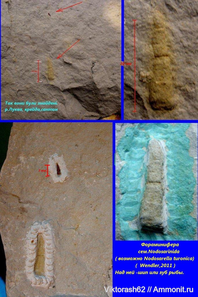 Найдена в мергелях сантонского яруса верхнего мела на р.Луква вблизи г.Галич. Над ней зуб или шип рыбы,точно мною не установлено,но по форме он 4-х гранный(видимо, все таки шип). Фораминифера больше походит на Nodosarella turonica (Wendler,2011)