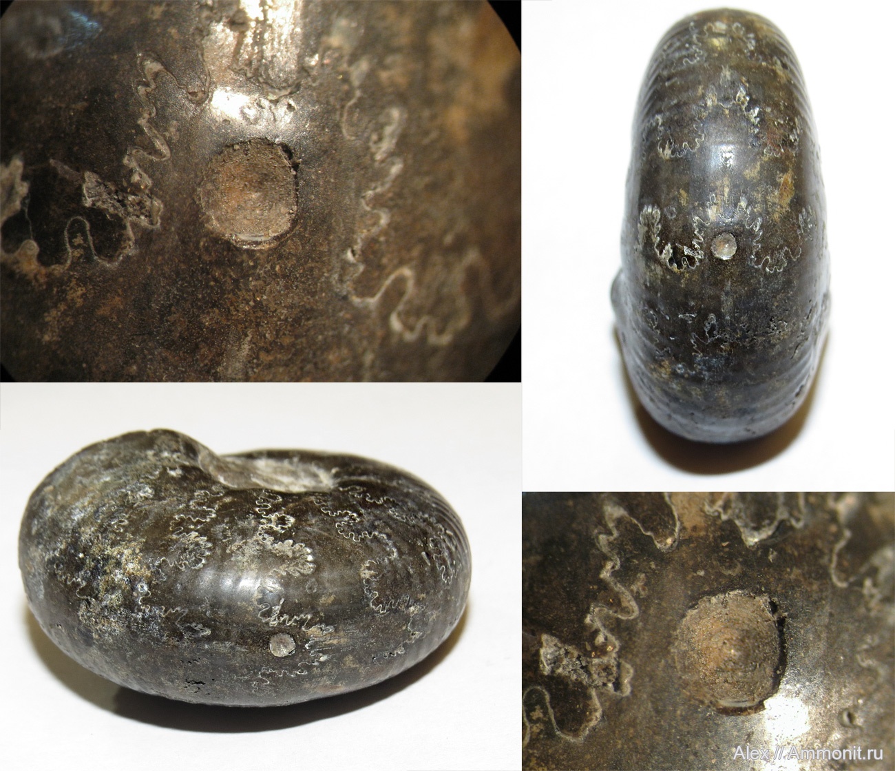 Этот небольшой фрагмокон Craspedites диаметром 3,5 см выглядит вполне обычно, но если присмотреться, можно заметить маленькое отверстие (его диаметр всего 1 мм) неподалеку от одной из перегородок. В нем видна небольшая коническая раковина, которая прикрепилась изнутри к стенке раковины аммонита. На просверленное отверстие это не похоже - внутри не порода, а именно чья-то раковинка с концентрическими линиями нарастания.