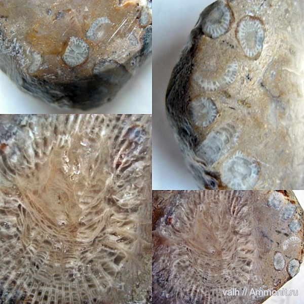 На верхних фото срез ругозы сем.Lithostrotionidae,Diphyphyllum sp.Поперечный размер кораллитов 2,5 - 3,0 мм.Отличается от других представителей семейства укороченными септами не выходящими за пределы диссепиментариума,отсутствием осевой структуры(столбика) и горизонтальным расположением табул,что хорошо видно на продольных срезах.Может быть переходной формой между diphyphylloid siphonodendron и diphiphillum . На нижнем фото срез нижнекарбоновой ругозы предположительно Axophyllum sp.