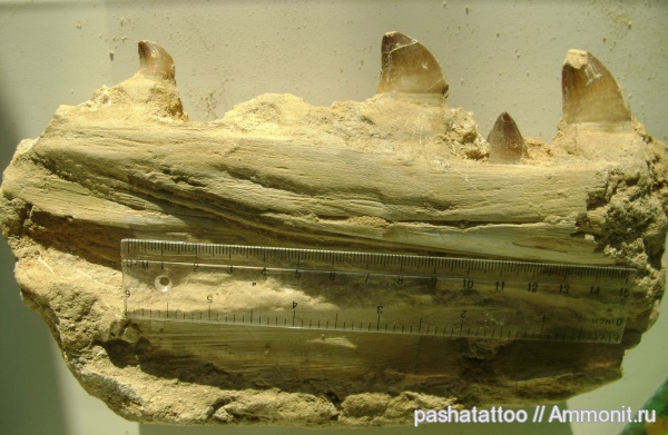 Интересно,смена зубов у мозазавра происходила как и у акул (старый выпал-новый вырос)? Смотрю,один из зубов меньше соседних,или это такой зубной ряд? | ||||||
