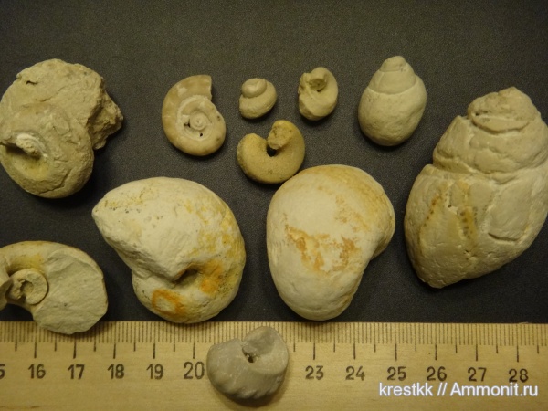 Однозначно-улитки,а объединяет их ось навивания раковины,большинства брюхоногих моллюсков. На второй,справа,даже сохранились элементы скульптуры. | ||||||