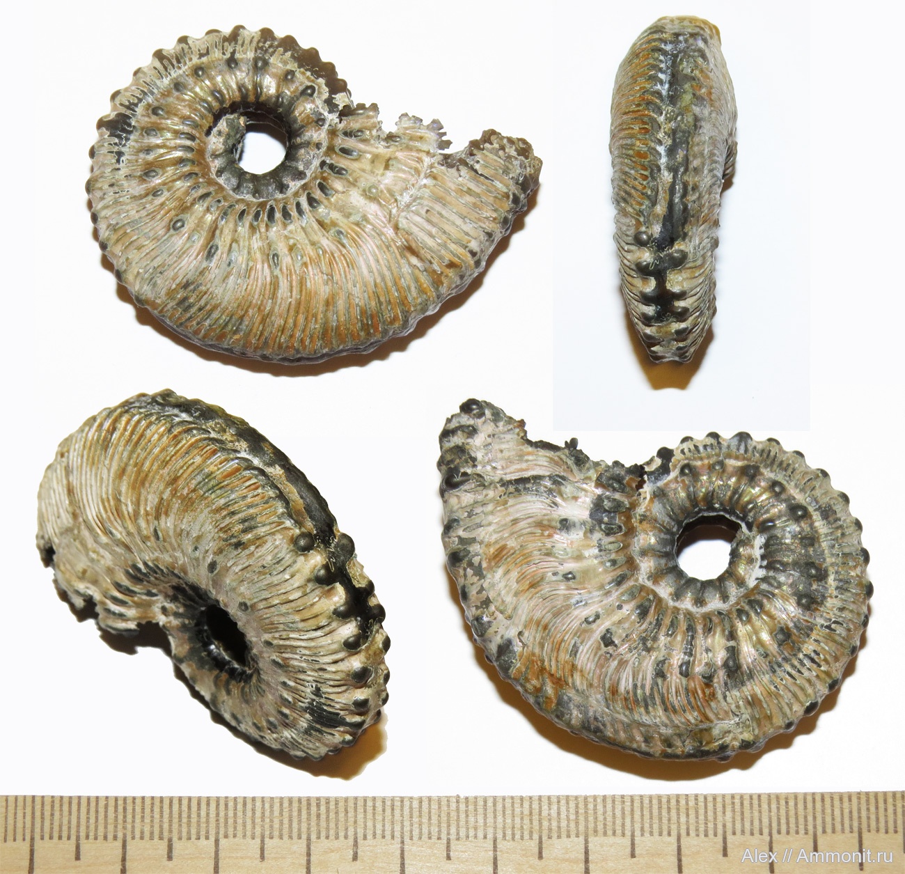 Этому аммониту Kosmoceras не очень везло - сначала какой-то хищник прихватил его за край раковины и мантию (фото внизу справа), а когда аммонит немного оправился, его почти так же укусили с другой стороны раковины (фото вверху слева). Даже после смерти злоключения этого космоцераса не закончились - он долго валялся в отвалах прежде чем был найден, в результате этого он ощутимо облез и слегка заржавел.