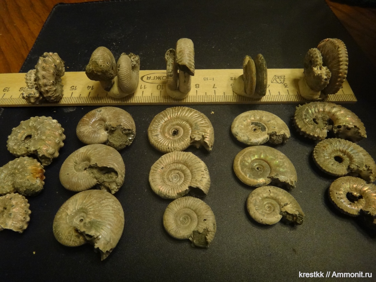 На самом деле неплохой набор михайловской аммонитовой фауны. Возраст этих аммонитов средняя юра, келловей. По родам тут слева направо Kosmoceras, Funiferites, Binatisphinctes, Brightia и снова Kosmoceras.