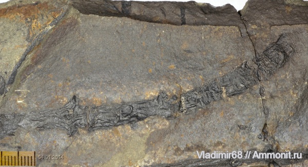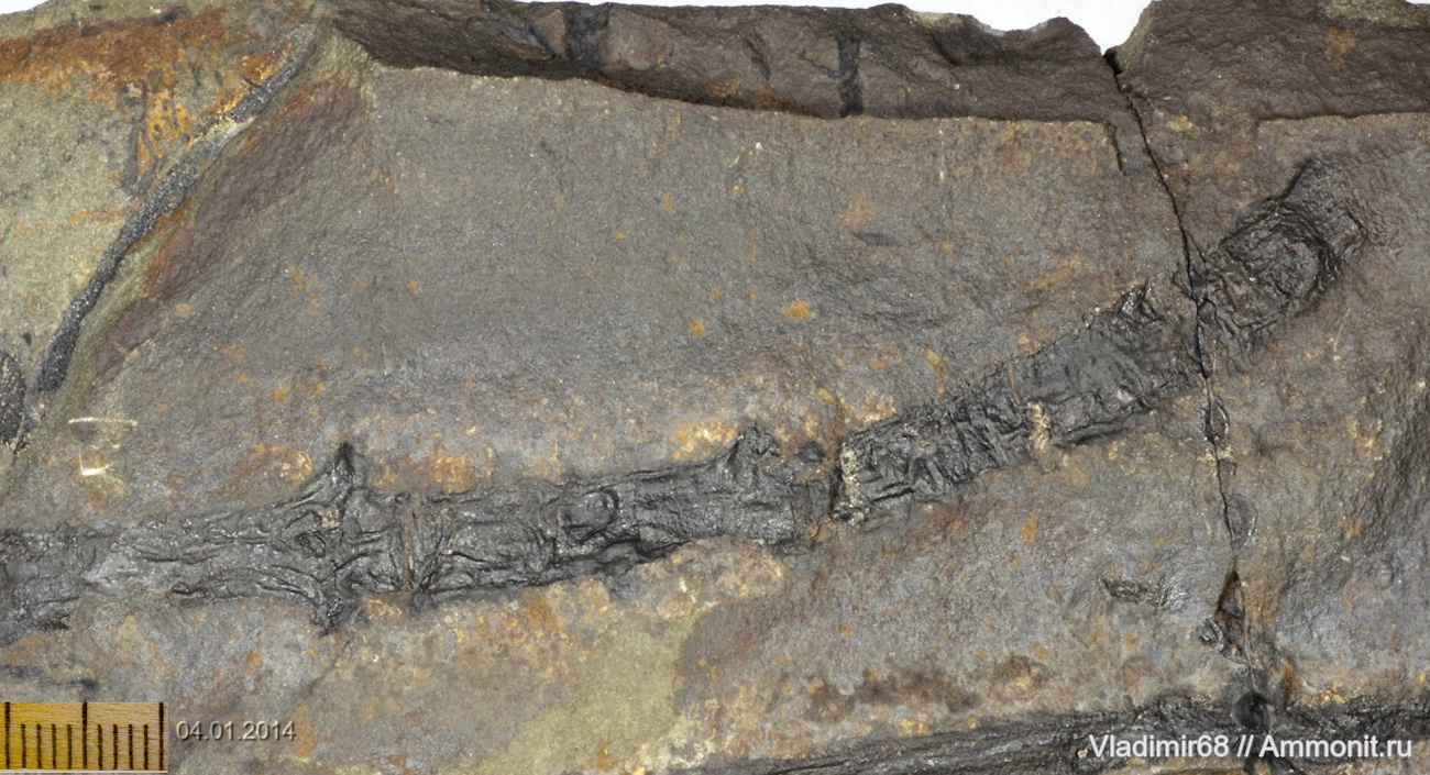 Этот образец и соседний Фрагмент ветки (побега?) хвойного, предположительно Elatides asiatica. - две стороны одной конкреции рядом множество хвои, подобные образцы я уже видел, и они были определены как «хвойное». Моё определение, конечно, не является окончательным и бесспорным. | ||||||