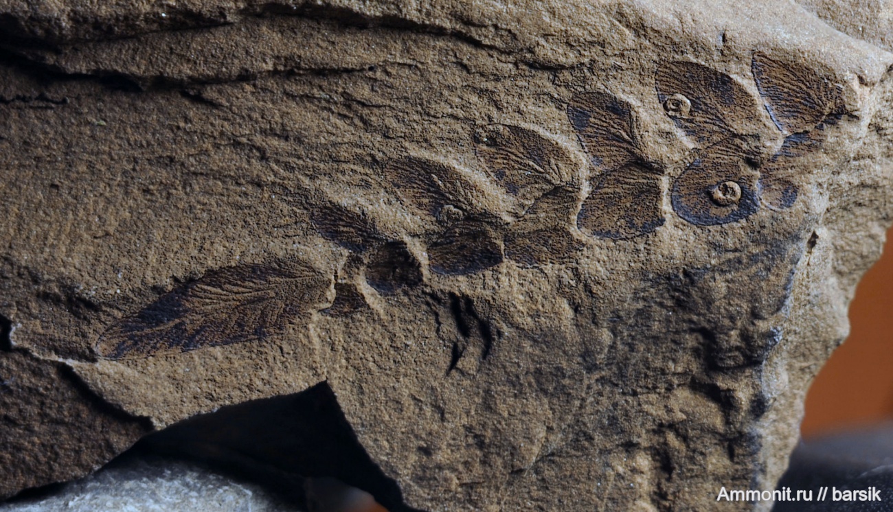 На основном снимке – фрагмент вайи семенного папоротника. Общая длинна ветки 45мм. На листьях Neuropteris расположились слепки домиков червей, которых относят к отряду Microconchida. Размер домиков - 0.8 – 0.9 мм.