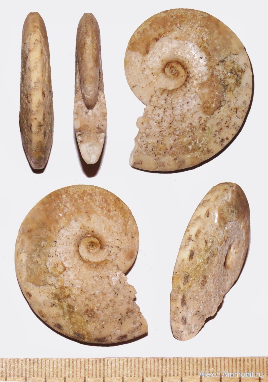 На фото один из этих аммонитов. Интересно, что у него в результате какой-то травмы сифон строился не по вентру, а по одной из боковых сторон (смотрите нижние фото) и лопастные линии оказались асимметричными.