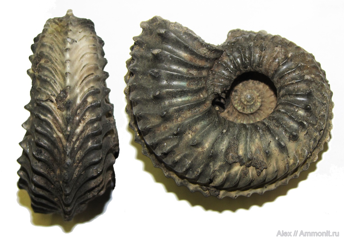 Cardioceras из коллекции МДЭБЦ (МГСЮН). Интересная толстая раковина, боковые лопасти на ребрах напоминают небольшие шипы. Диаметр 4,5 см. Место находки не указано, но судя по сохранности скорее всего это Стойленский ГОК.
