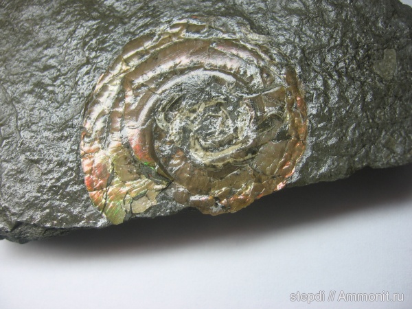 Иризирующий аммонит Psiloceras planorbis. Приобретен у продавца из Испании на аукционе eBay. Размер аммонита около 30 мм. По сохранности и условиям захоронения (в сланцах) напоминает канадский аммолит. Как и аммолит, покрыт лаком для предохранения от разрушения. Возраст: раннеюрская эпоха, геттангский век. Место находки: Watchet, Сомерсет, Великобритания.