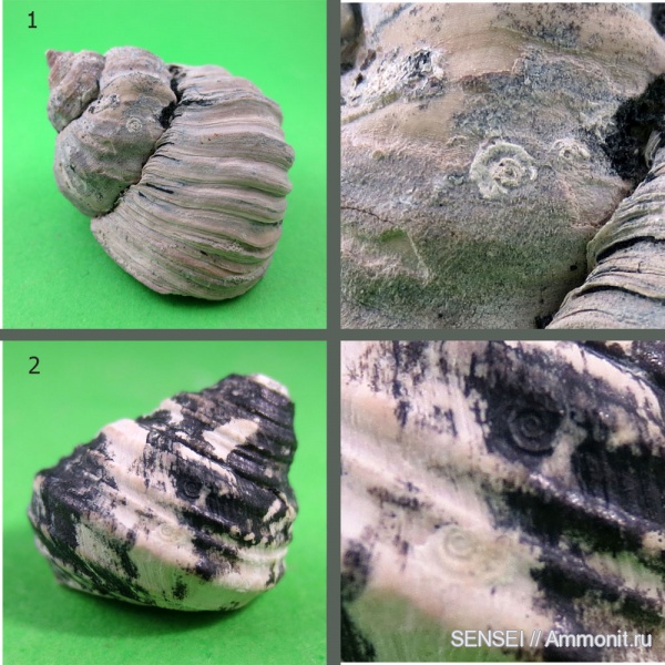Обнаружил интересные спиралевидные следы на раковинах сарматской Barbotella intermedia,с реки Белая и чокракской Gibbula tschokrakensis из Крымского района. Больше всего это напоминает обрастание Spirorbis.