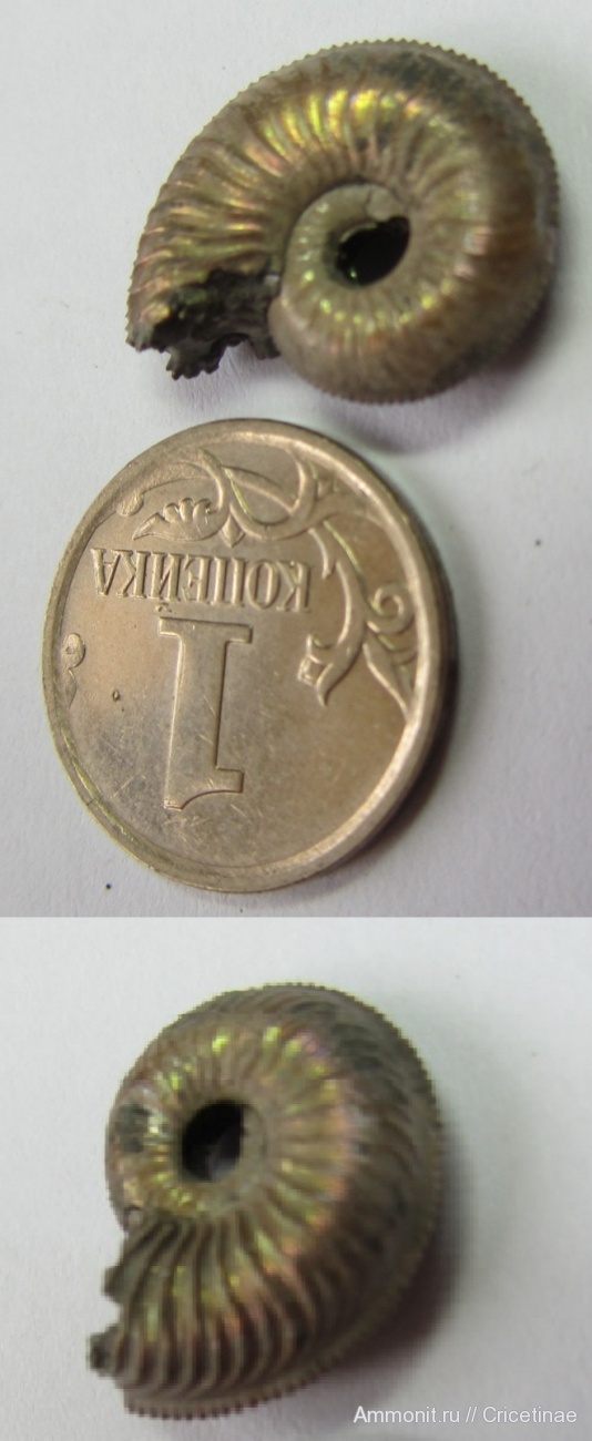Перламутровый аммонит, замещённый пиритом. Выкопан в декабре 2013 года в коренном слое глины. На самом деле этот перламутровый малыш был побольше (раза в 4), но пиритом заместилась только маленькая центральная часть, а большая часть аммонита была раздавлена в перламутровую труху.